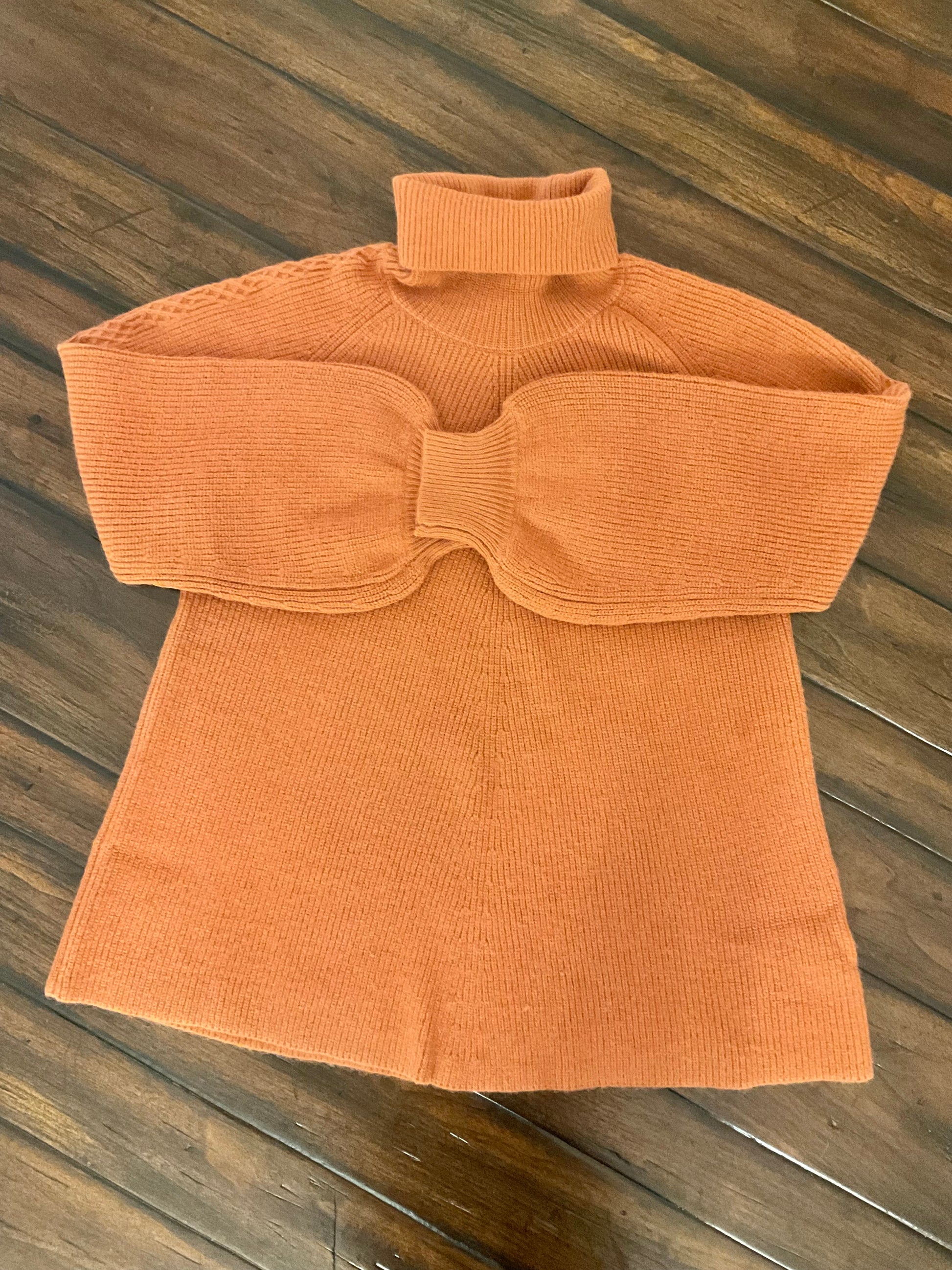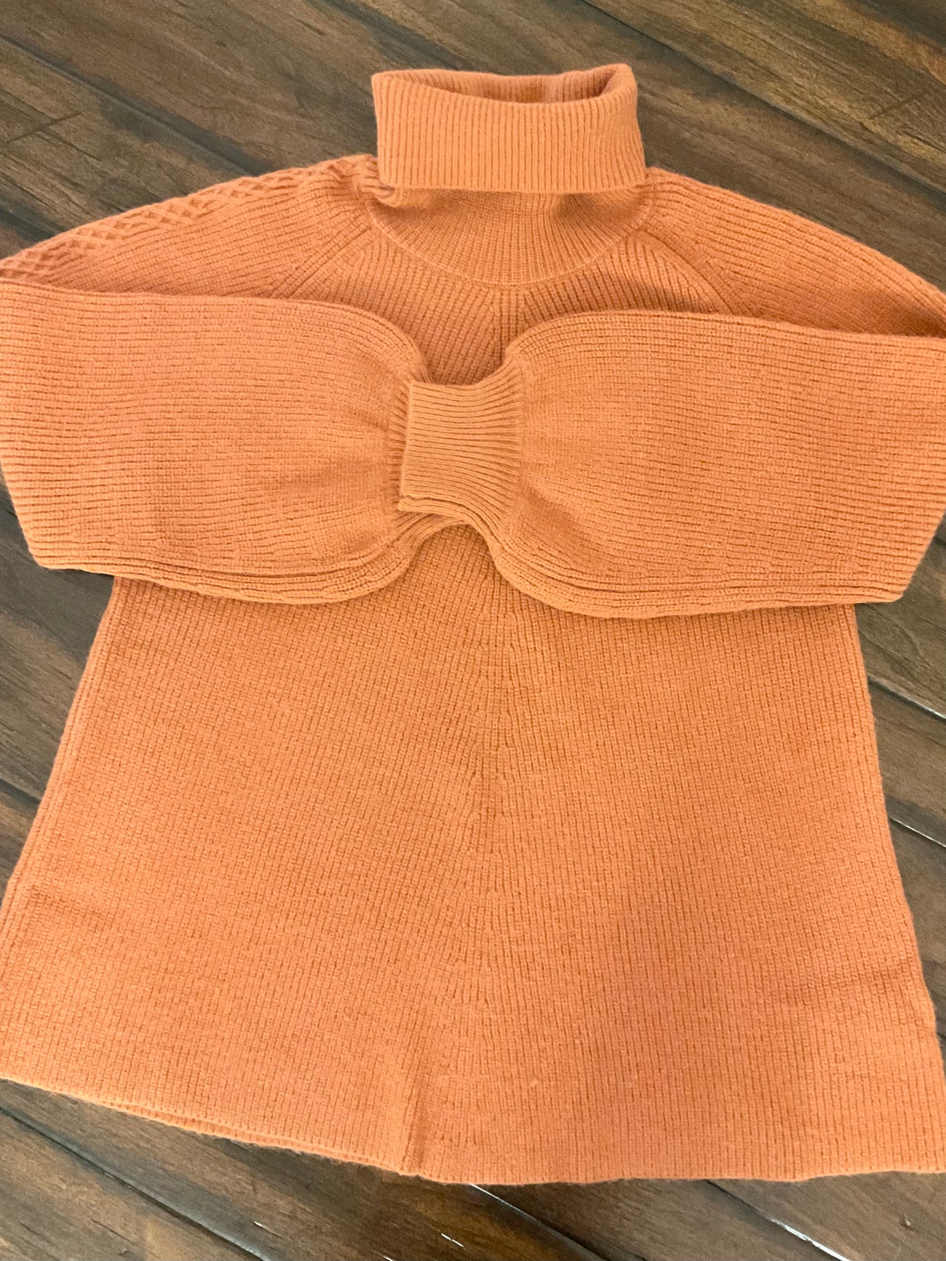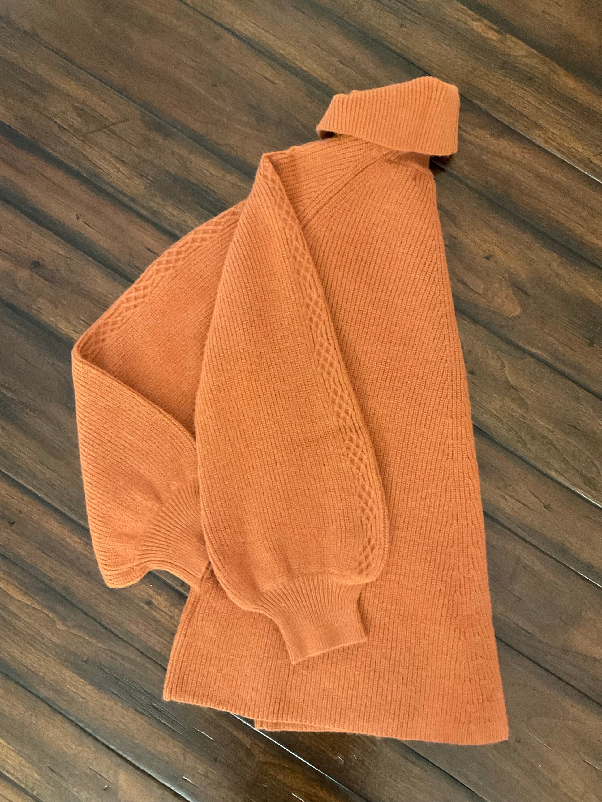 You are sure to love this stylish sweater.  Features a flowy relaxed fit with a turtleneck and balloon sleeves.  The classic rich color and and soft knit will have you reaching for this sweater on those crisp days.