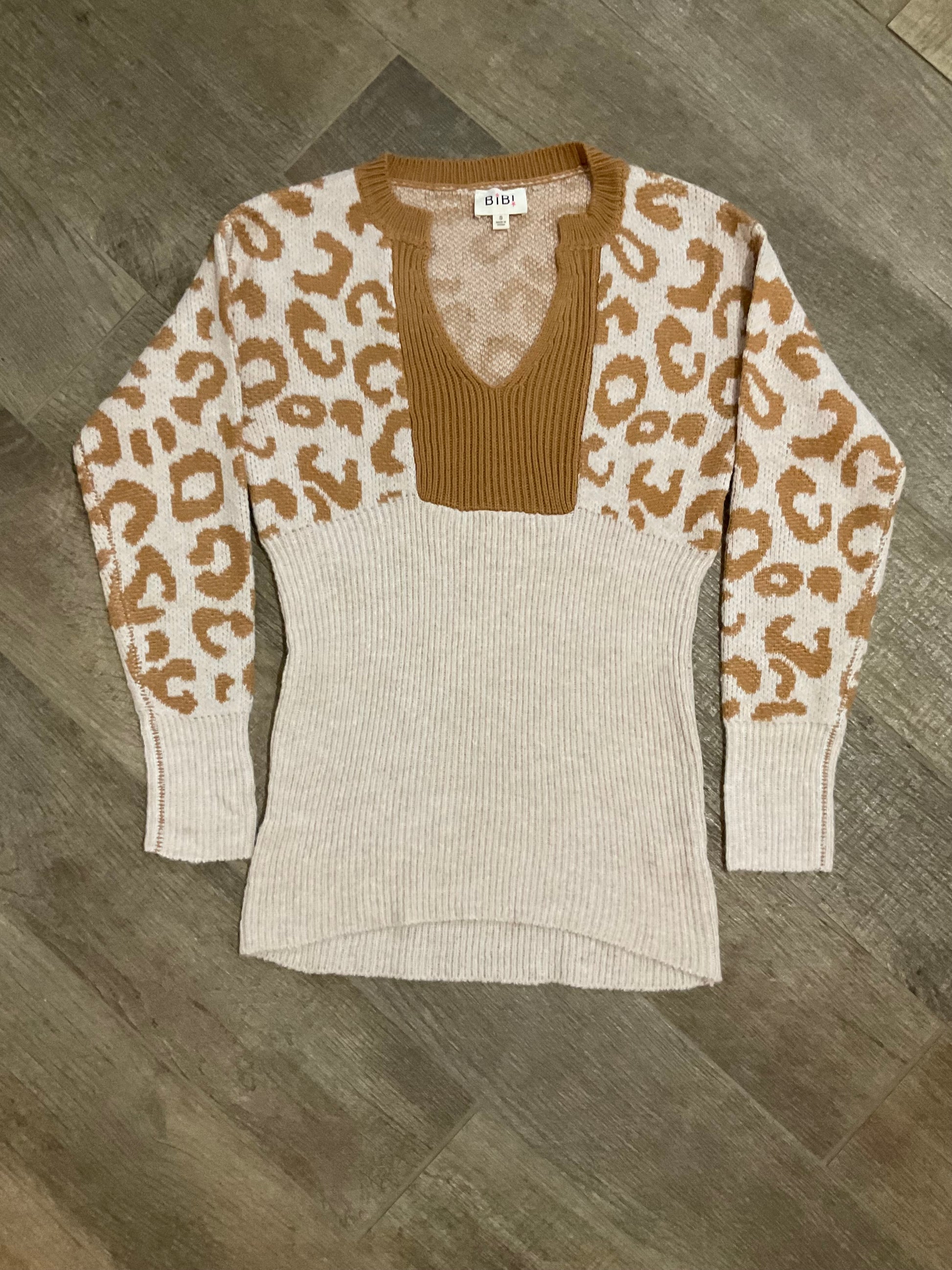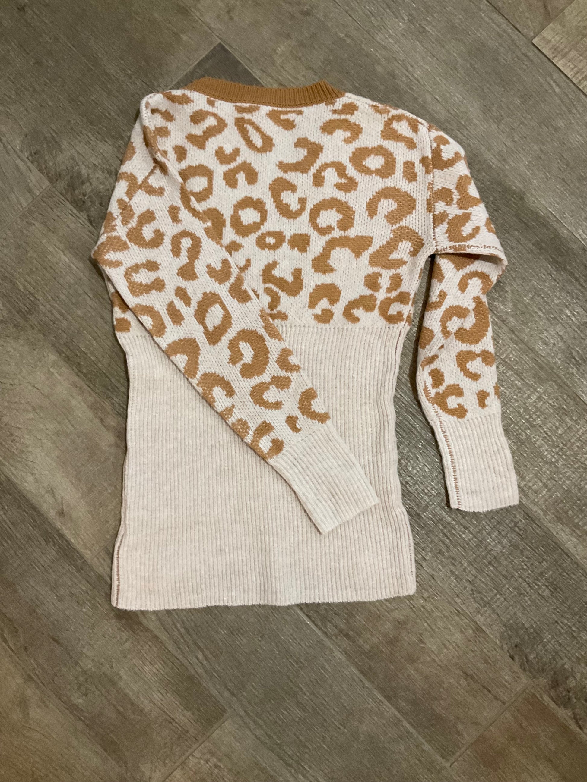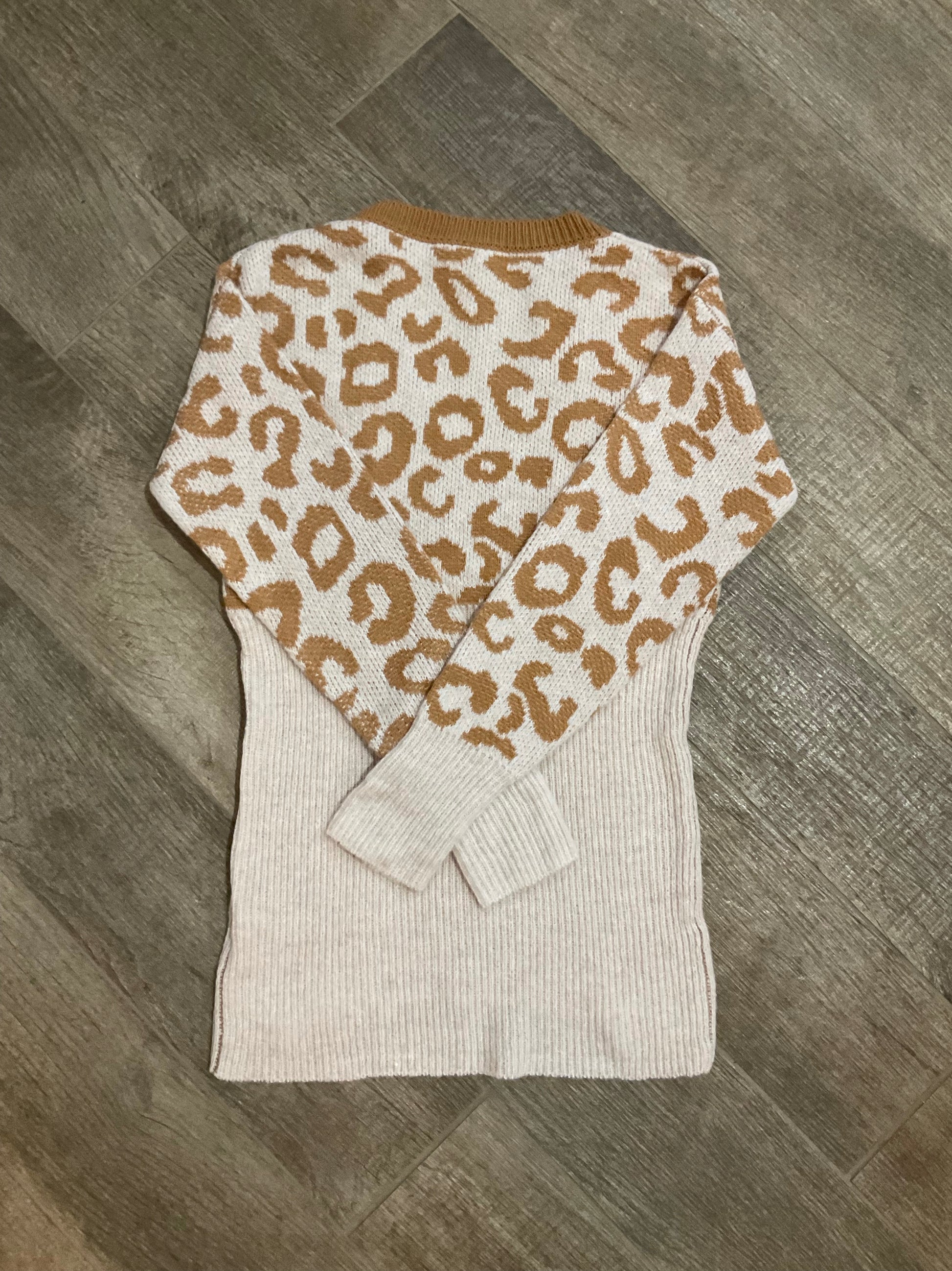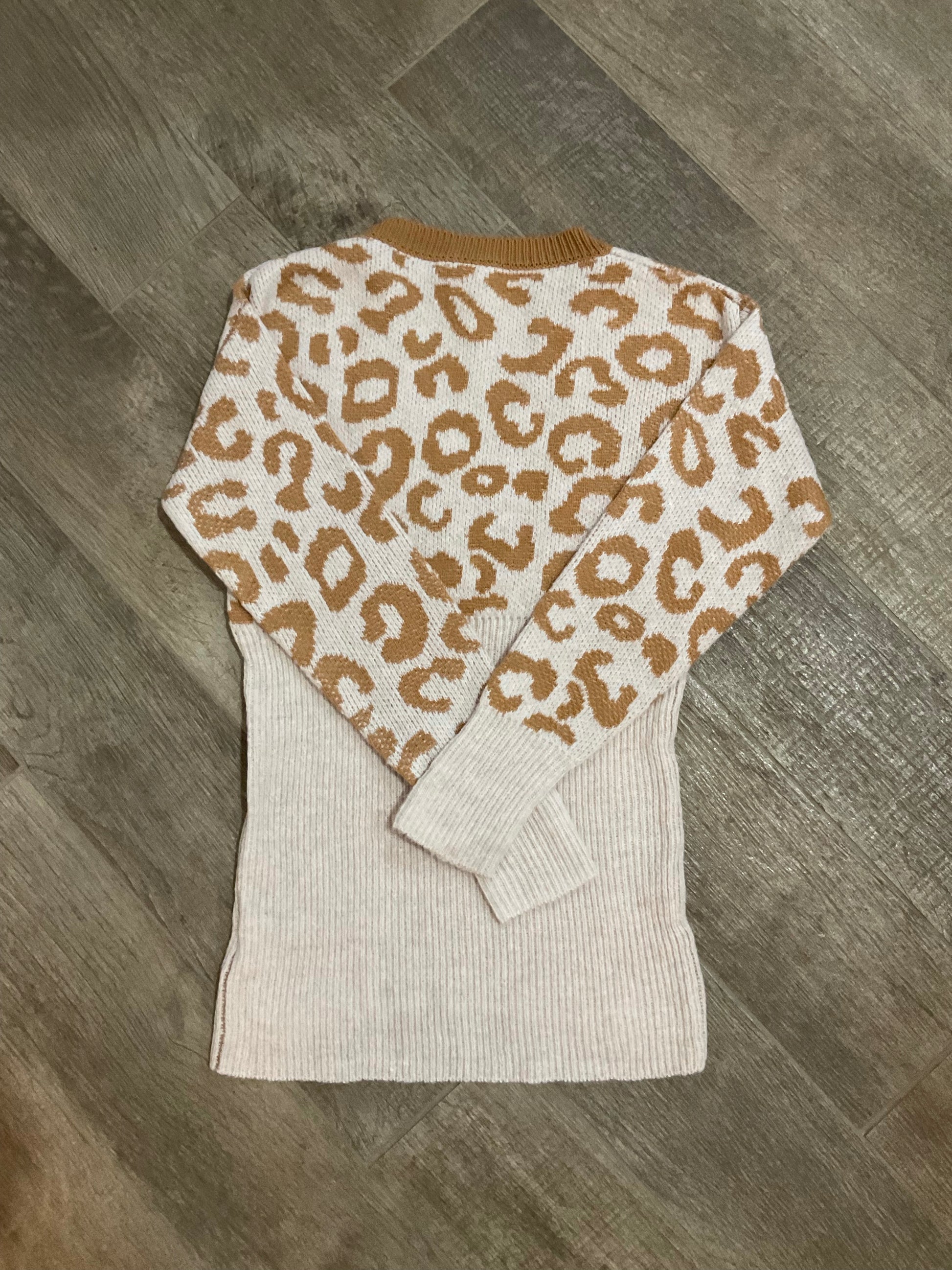 A perfect lightweight sweater for the season. We are loving this taupe sweater with animal print in a beautiful golden color. Featuring a unique v neck and a lightweight feel, this fun sweater is the perfect go to.