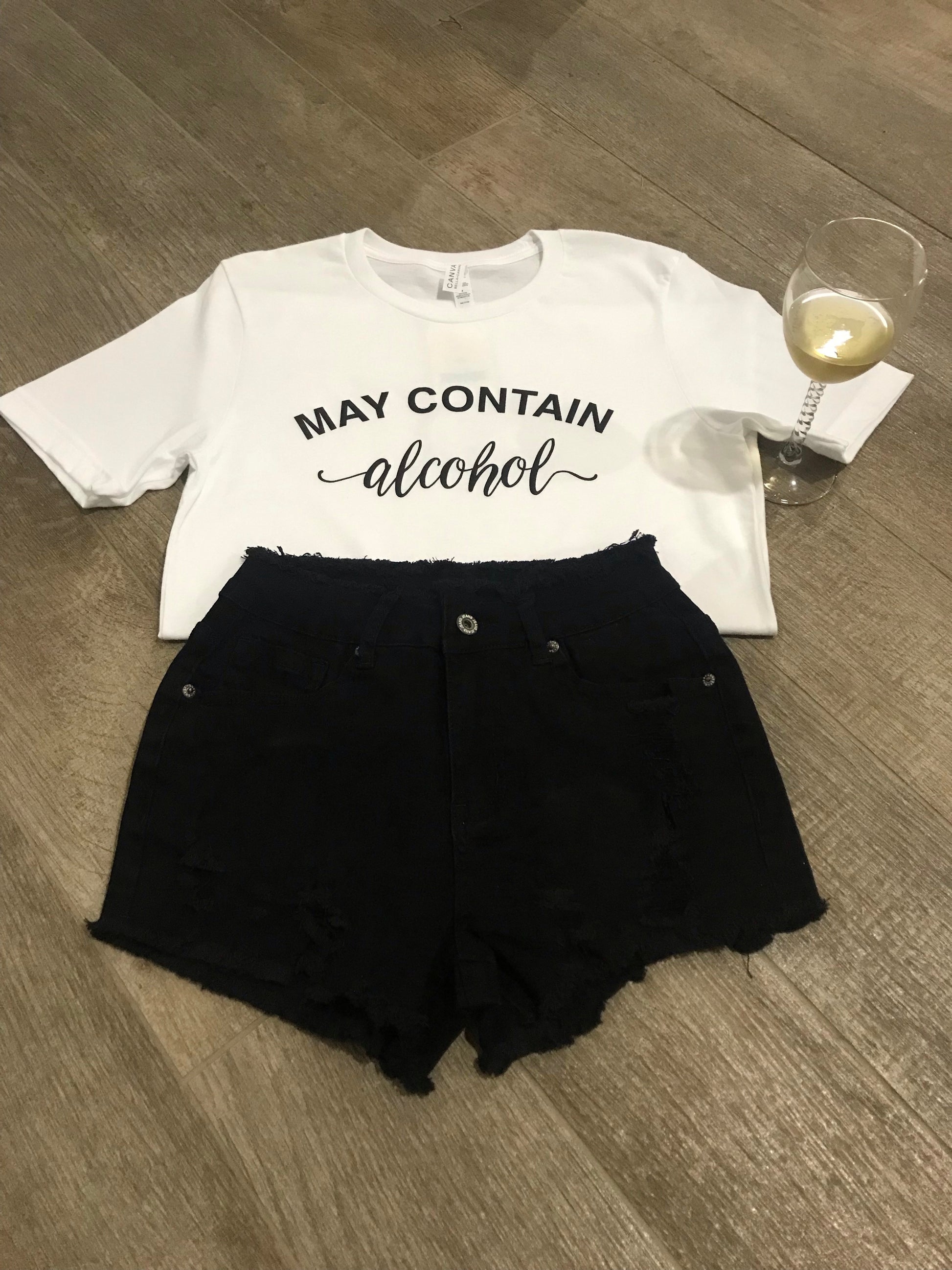 This fun graphic tee is sure to make a bold statement. Â Features a classic solid grey or white Bella Canvas tee with "May Contain Alcohol" printed across the front. Â Perfect for relaxing on the weekends and hanging out with friends.