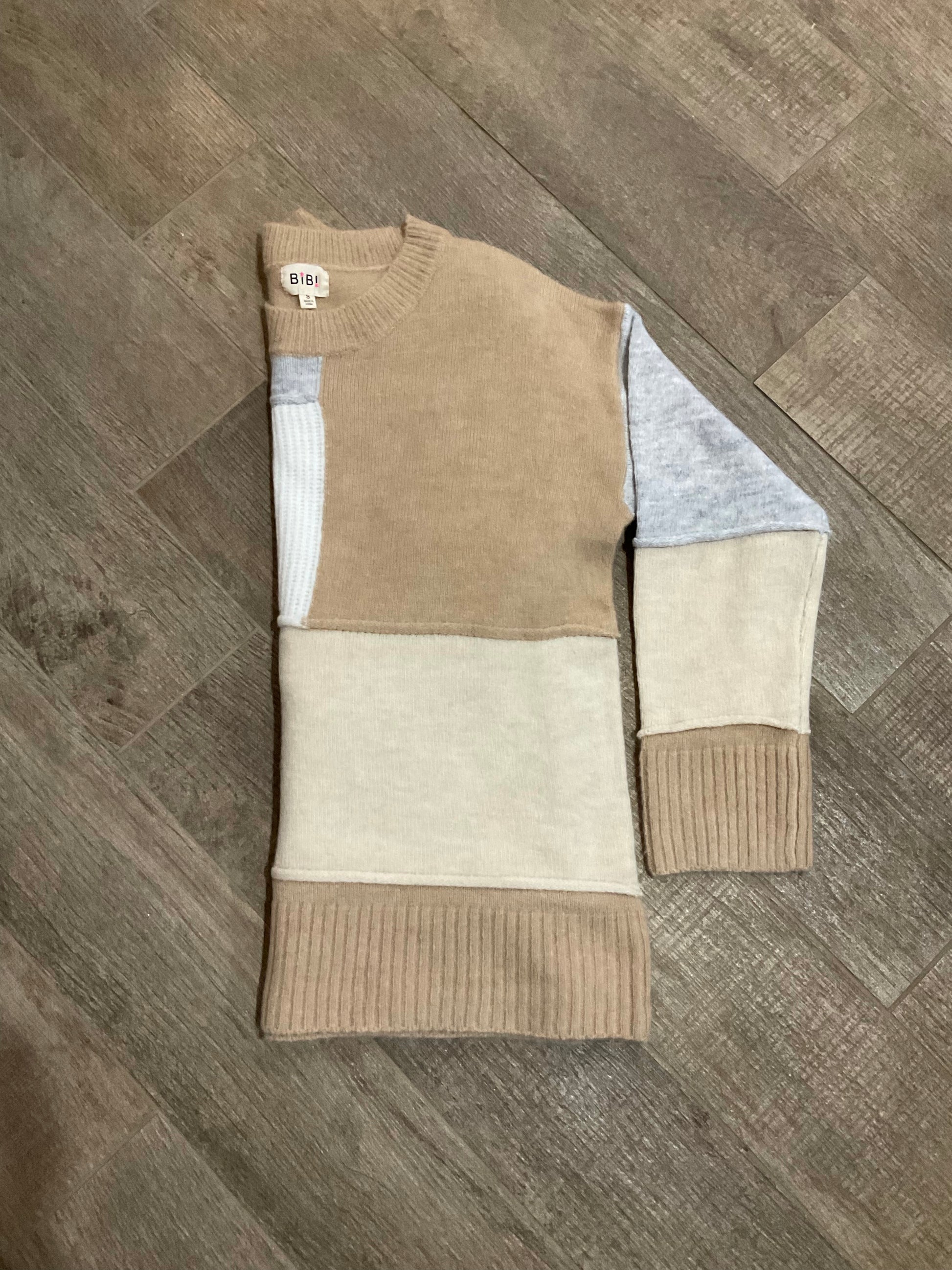 This mid weight textured sweater features a fun color block style in beige, grey, and white. We love the different patterns throughout. Such a fun & unique sweater for the season.