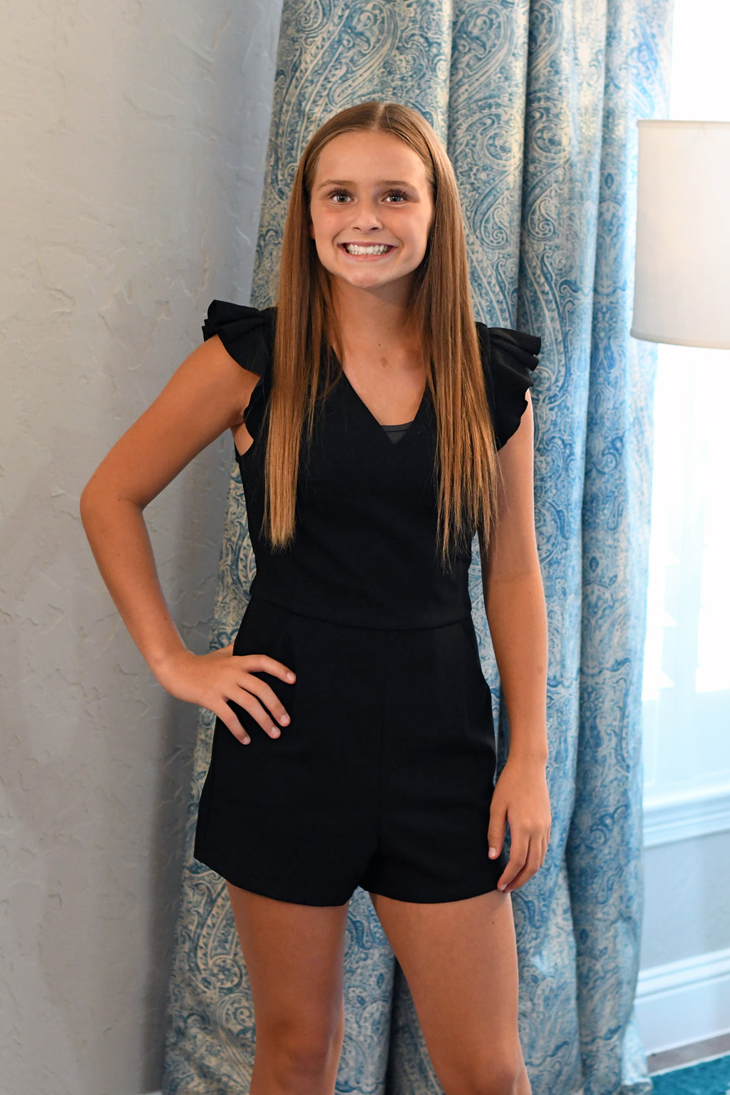 A must have! This cute solid ruffle sleeve romper features a v neck, two functional pockets, and a zip closure in the back.  Fully lined and fitted. Dress it up or down. Available in black or white.