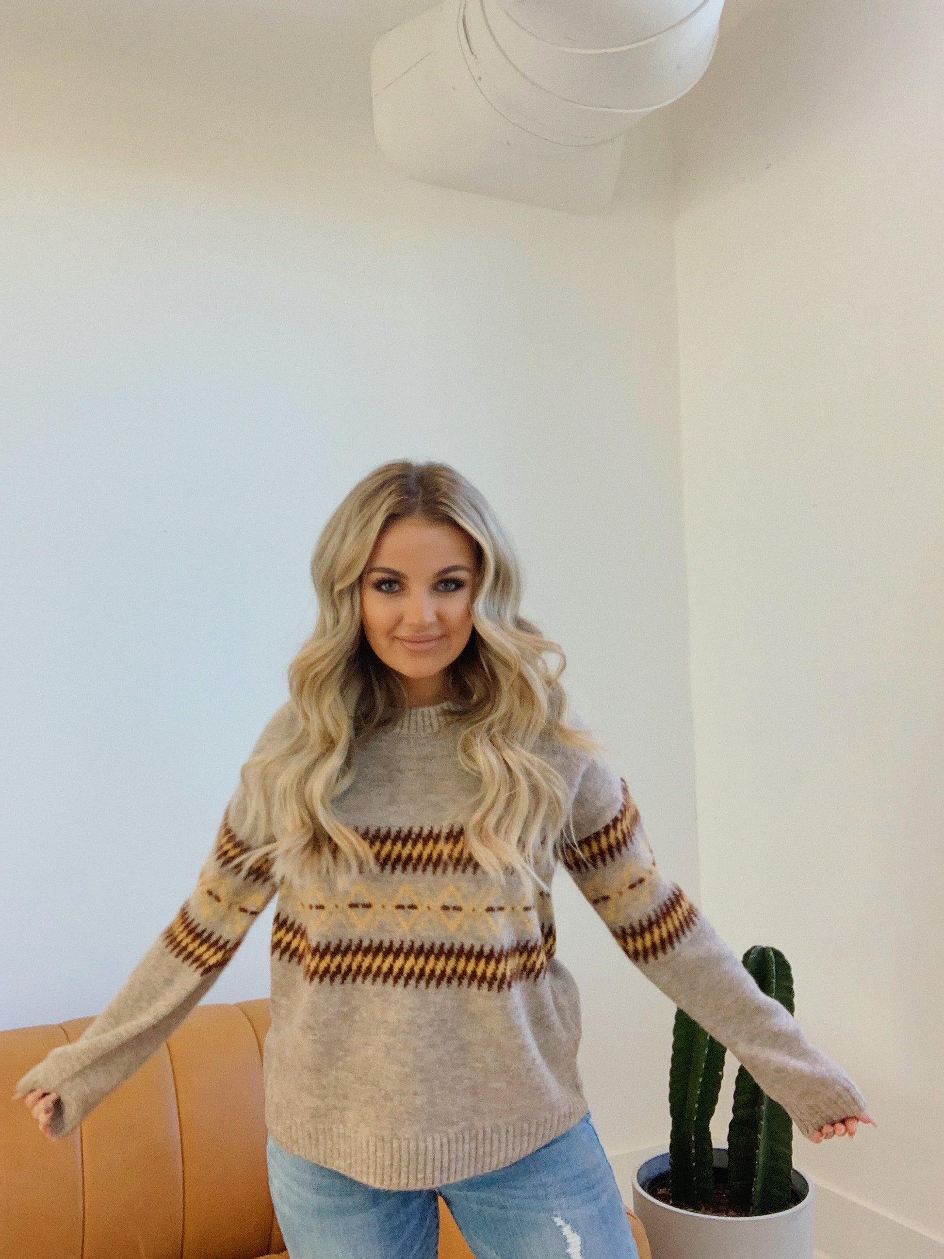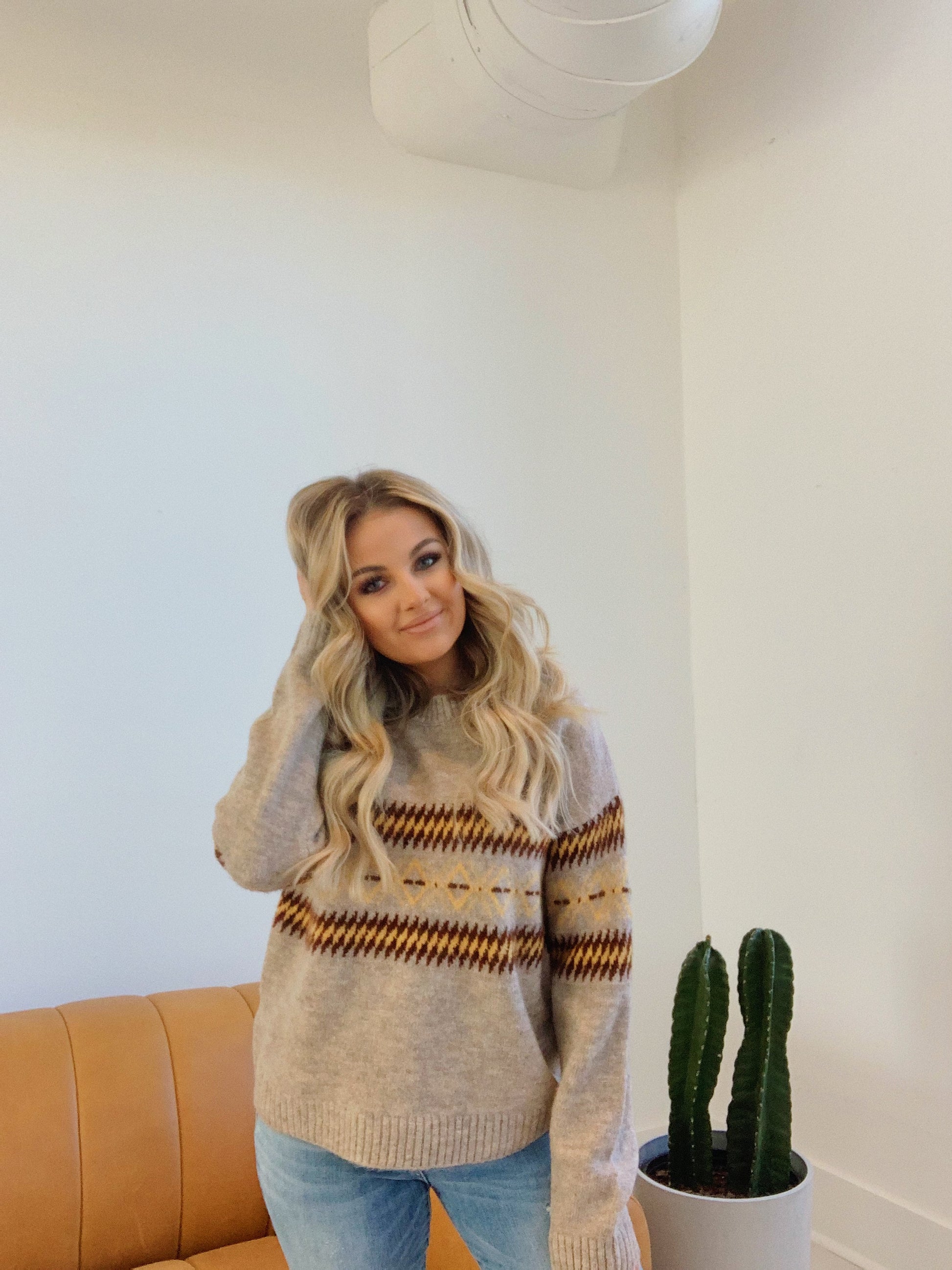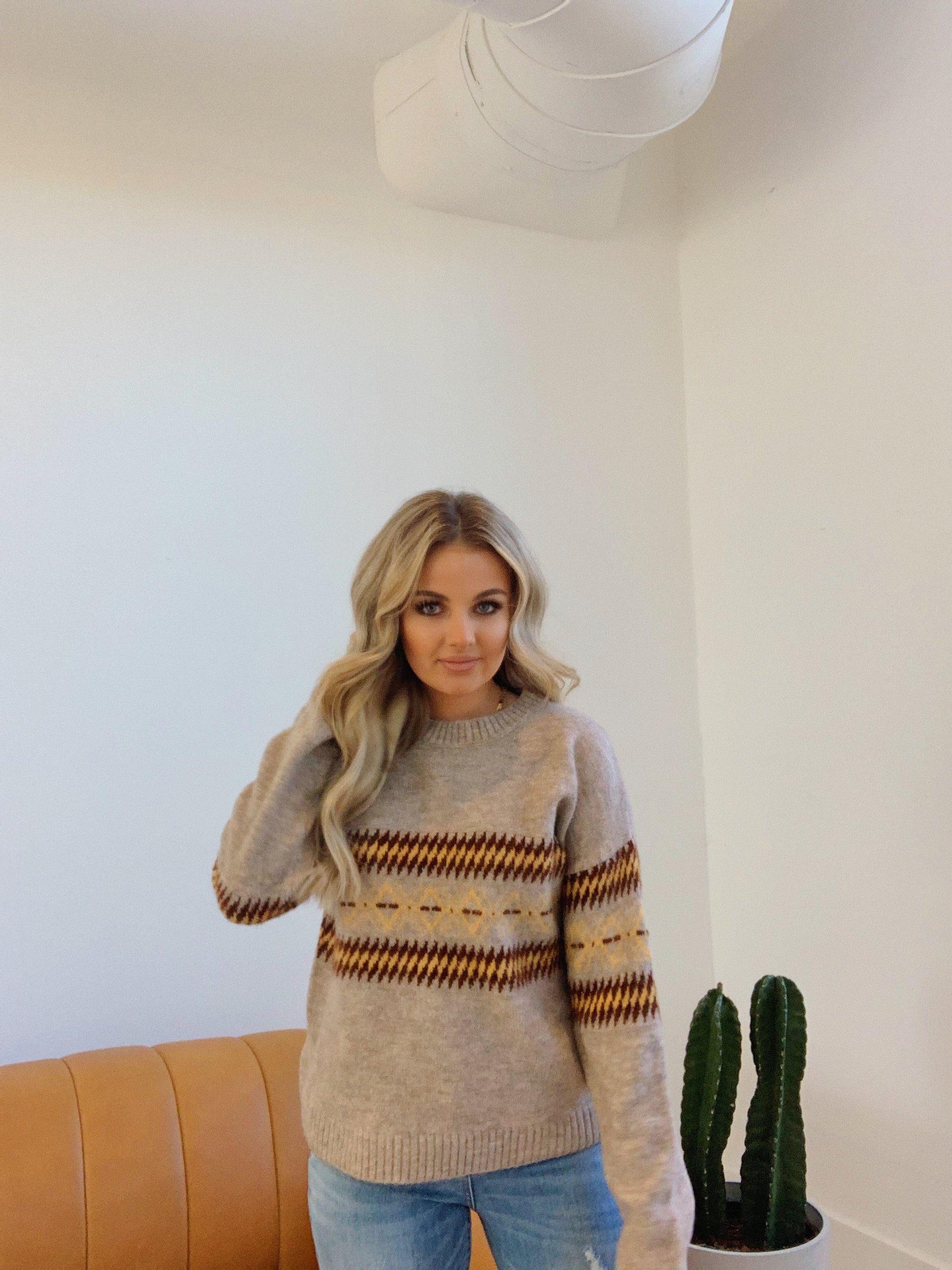 We love this cute sweater.  This taupe sweater features a rounded neck and a fun edgy pattern in mustard and brown. The perfect go to sweater!