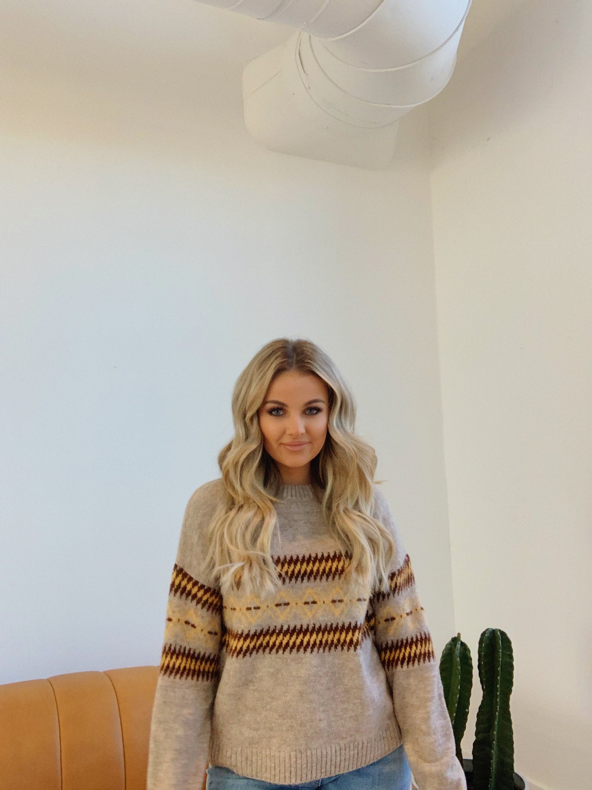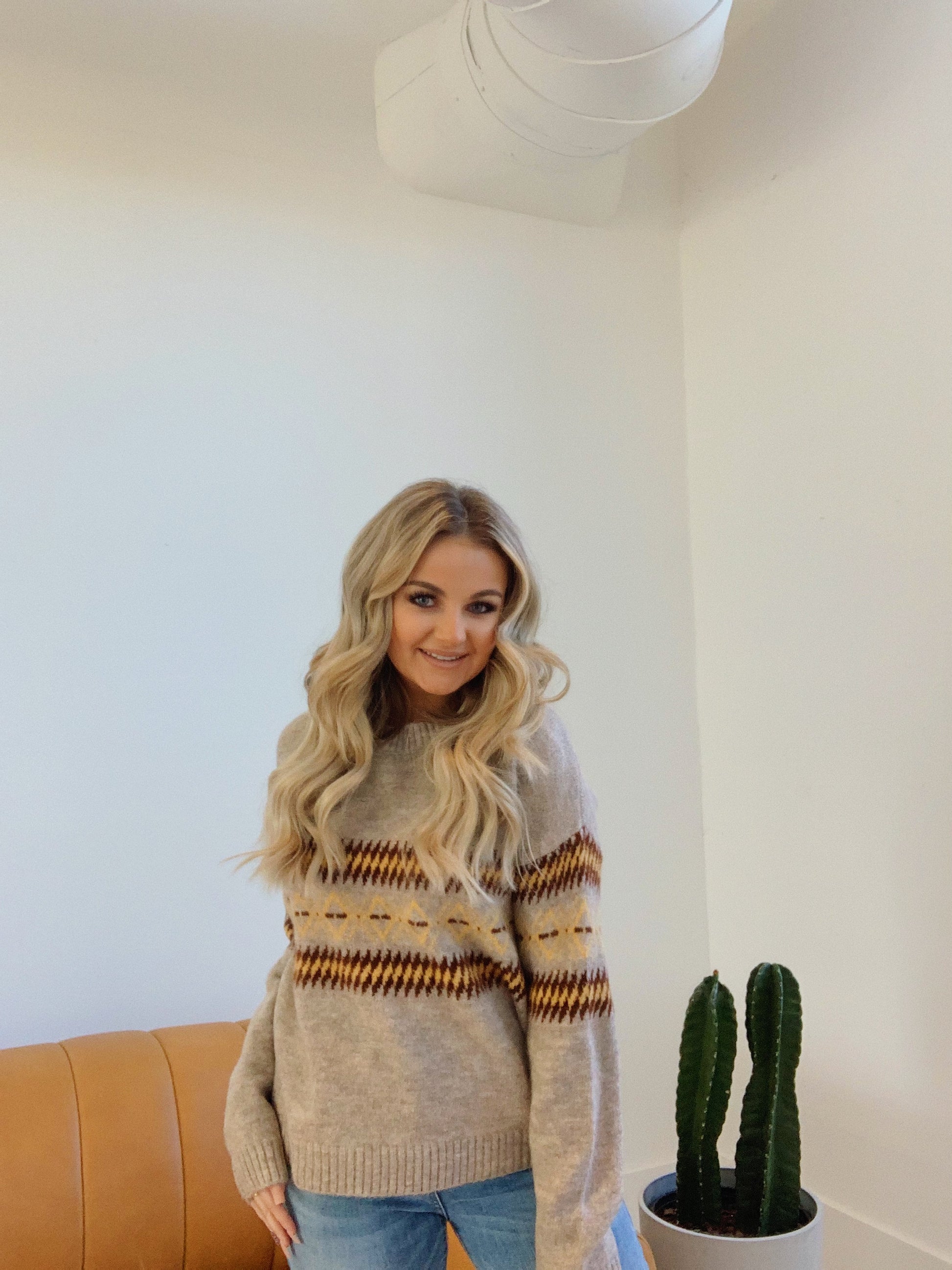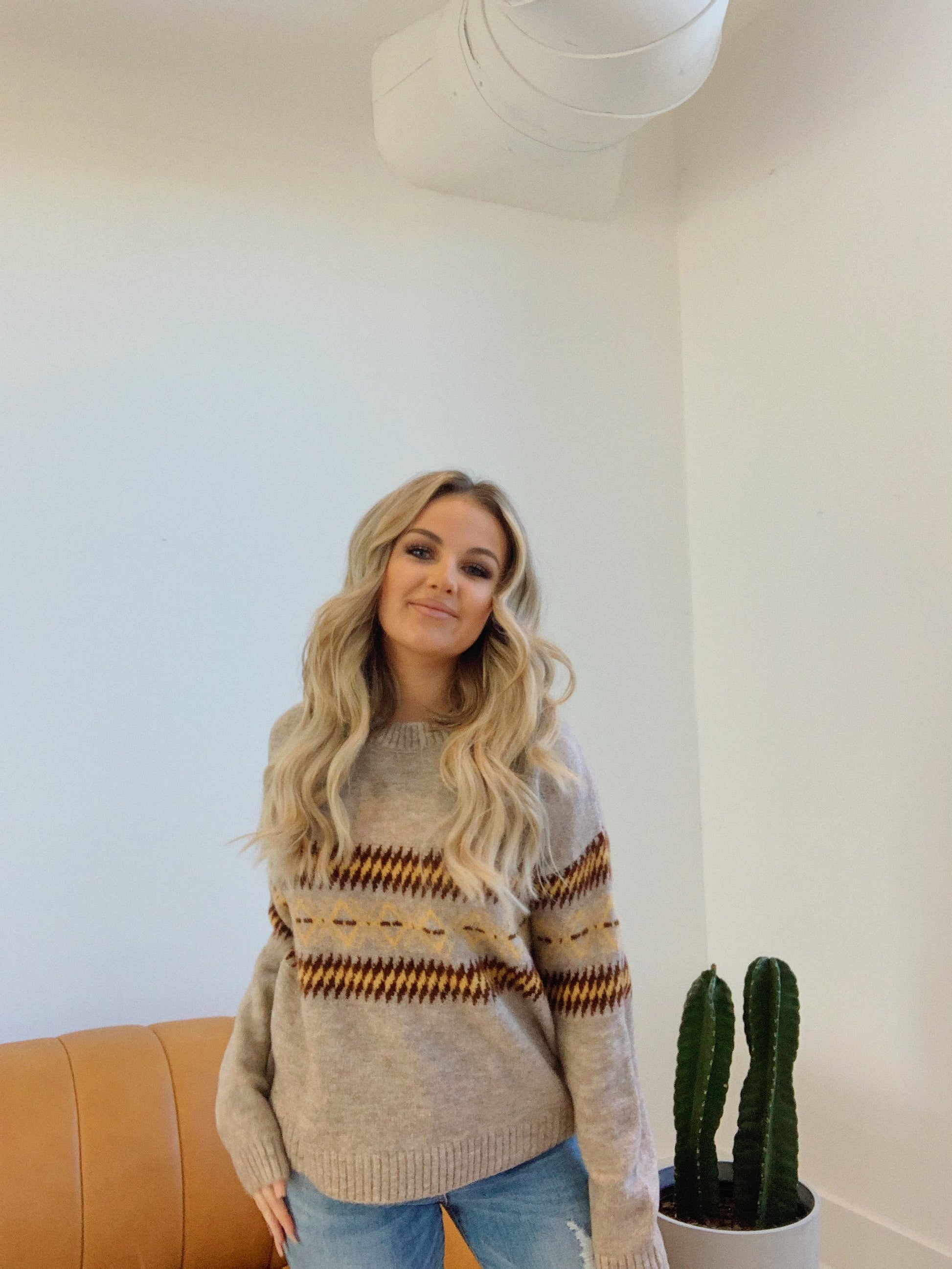 We love this cute sweater.  This taupe sweater features a rounded neck and a fun edgy pattern in mustard and brown. The perfect go to sweater!